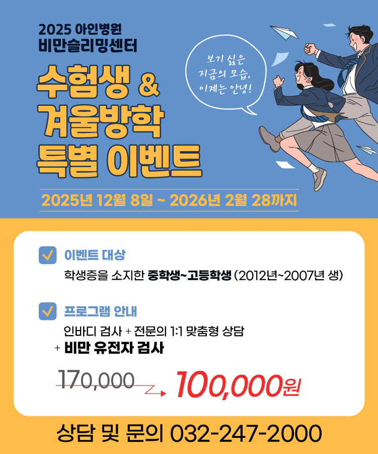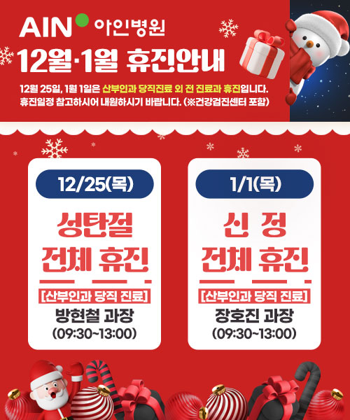 온라인 진료예약 빠른 진료예약 자녀진료예약 건강검진예약 대표전화 032) 247-2000 검진센터 032) 459-5000 예약조회 및 변경/취소 척추·관절 상담 통합검색 마이 아인 온라인상담 진료예약현황 검사결과조회 아인병원 TV 아인병원의 새로운 소식과 궁금했던 점들을 유튜브에서 시청해보세요. 외래진료안내 입/퇴원안내 진료시간표 증명서 발급안내 자주하는 질문(FAQ) 신생아 앨범 층별안내 오시는길 주차안내 척추관절 아인비난임 면역증진 건강검진 비만슬리밍 메디컬뷰티 산후 조리원 마더비 문화원수강신청 층별안내 오시는길 주차안내 공지사항 언론보도 채용공고 더보기 공지사항 더보기 [병원소식/갑상선암센터] 임산부도 안심하고, 안전하게 갑상선암치료가 가능합니다. [병원소식] 25년 11월 임신 성공 / 쌍둥이 출산을 축하드립니다. [공지] 12월(성탄절)·1월(신정) 진료 및 휴진 일정 안내 [이벤트/비만슬리밍센터] 아인병원 비만슬리밍센터 수험생&겨울방학 특별 이벤트 ❄️☃️ (~2/28) 보도자료 더보기 한국 ‘단일공 로봇수술’, 美-유럽도 배우러 온다 [척추외과] 반복되는 목 통증과 팔저림, 치료 선택이 필요한 시점 아인병원 '갑상선암 로봇수술'에 미국·유럽 의료진 관심 잇따라 "잘 갖춰진 시설과 선진 의료기술 배웠으면 해요" 중국 의료진 방문 채용공고 더보기 상근직 간호사 채용2025-07-03 차량운영팀 차량관리직 채용2025-12-17 건강검진팀 행정직 채용2025-12-19 부서별 간호조무사 채용2025-03-20 층별안내 오시는길 주차안내 진료카드 창 닫기