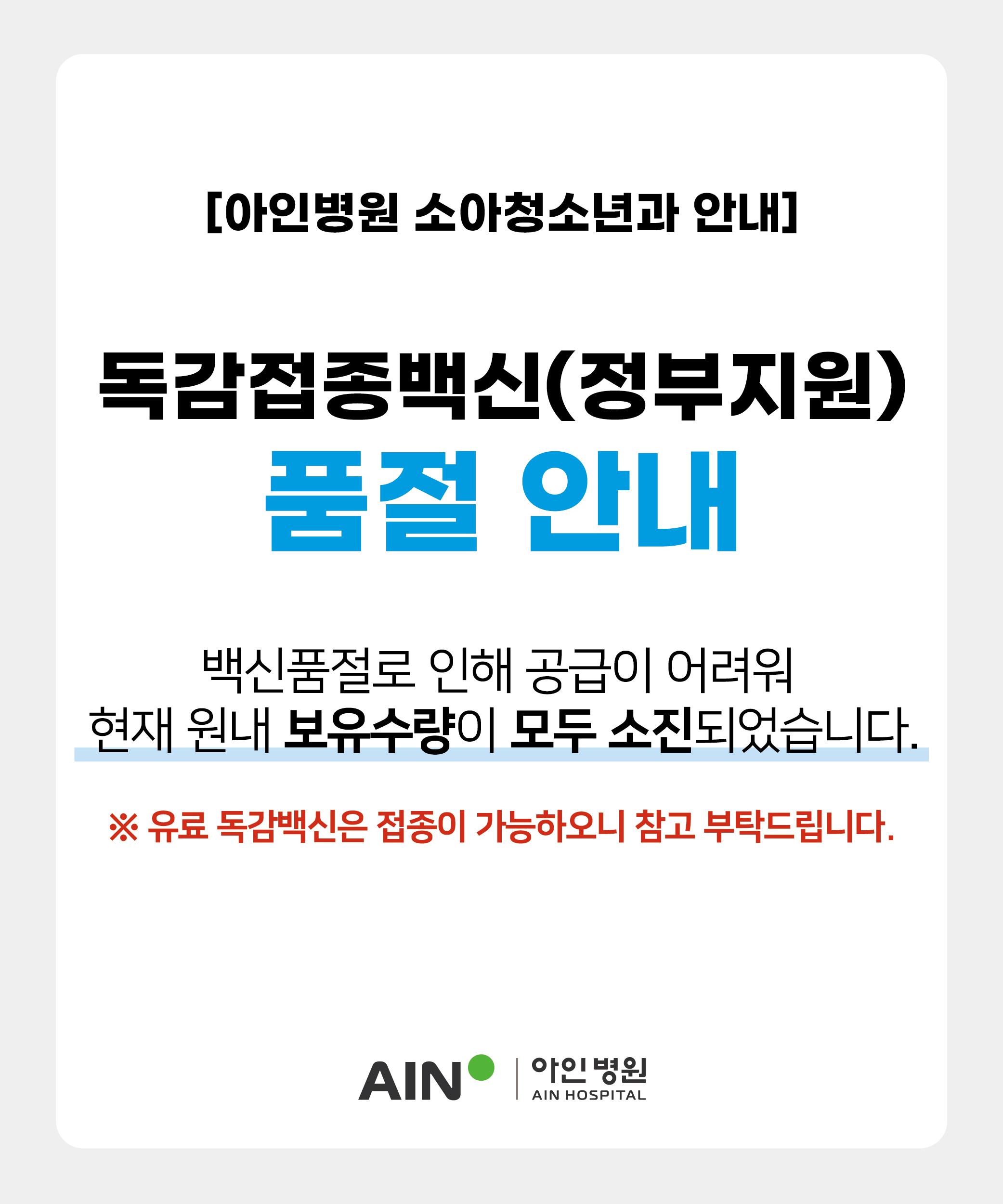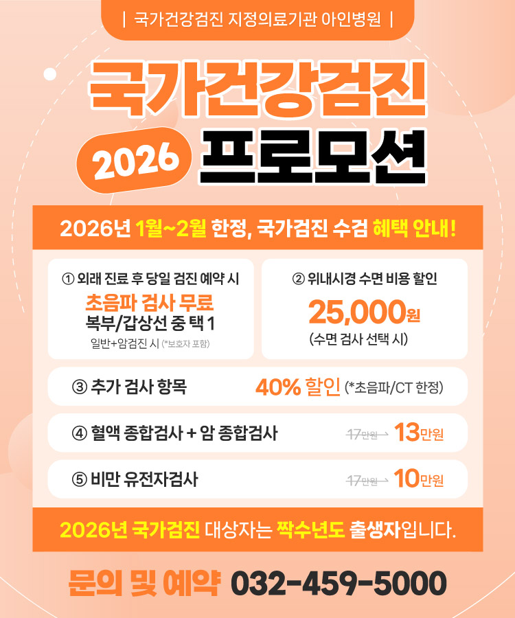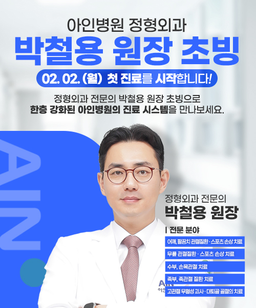 온라인 진료예약 빠른 진료예약 자녀진료예약 건강검진예약 대표전화 032) 247-2000 검진센터 032) 459-5000 예약조회 및 변경/취소 척추·관절 상담 통합검색 마이 아인 온라인상담 진료예약현황 검사결과조회 아인병원 TV 아인병원의 새로운 소식과 궁금했던 점들을 유튜브에서 시청해보세요. 외래진료안내 입/퇴원안내 진료시간표 증명서 발급안내 자주하는 질문(FAQ) 신생아 앨범 층별안내 오시는길 주차안내 척추관절 아인비난임 면역증진 건강검진 비만슬리밍 메디컬뷰티 산후 조리원 마더비 문화원수강신청 층별안내 오시는길 주차안내 공지사항 언론보도 채용공고 더보기 공지사항 더보기 [병원소식] 25년 12월 임신 성공 / 쌍둥이 출산을 축하드립니다. [병원소식] 아인병원 정형외과 전문의 박철용 원장 2026년 2월 2일 (월) 진료 개시 [공지] 소아청소년과 독감접종백신 품절 안내 [이벤트/피부뷰티] 민트실리프팅 이벤트 - 깊은 주름 얼굴라인까지 확실하게! ✨~(2/28) 보도자료 더보기 갑상선 결절, 수술 없이 ‘고주파 시술’로 치료로 인천 미추홀구치매안심센터, 11개 병원과 치매 조기 검진 활성화 업무협약 체결 인천 미추홀구 주안4동, 아인어린이집으로부터 라면 700개 전달받아 [2026년 인천 첫 분만] 병오년, 300만 인천시민의 소망은 채용공고 더보기 영상의학팀 초음파사 채용2025-10-24 차량운영팀 차량관리직 채용2025-12-17 보험본부 원무팀 자보/산재 채용2025-10-01 부서별 간호조무사 채용2025-03-20 층별안내 오시는길 주차안내 진료카드 창 닫기