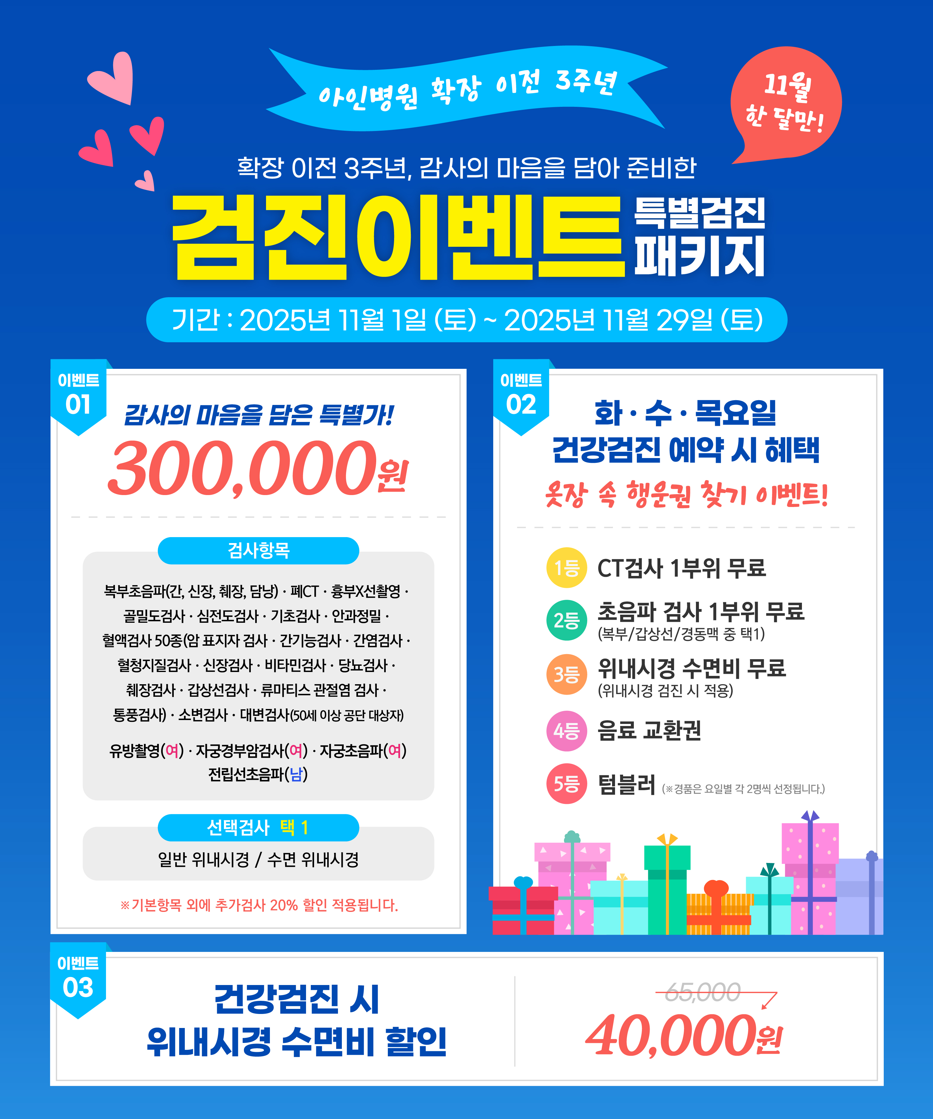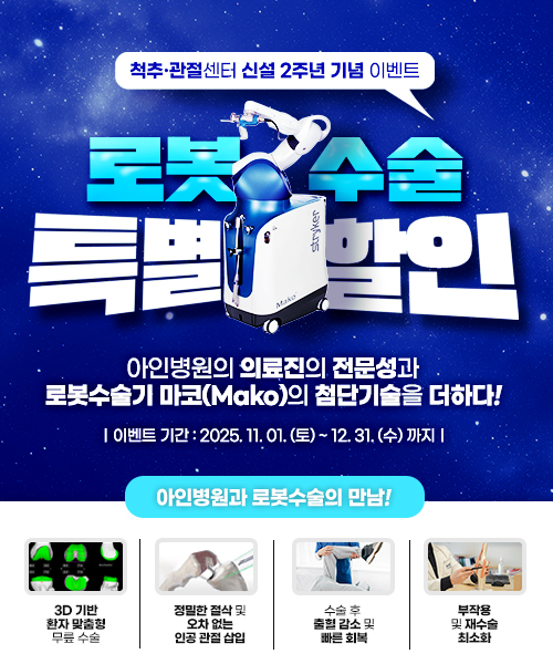 온라인 진료예약 빠른 진료예약 자녀진료예약 건강검진예약 대표전화 032) 247-2000 검진센터 032) 459-5000 예약조회 및 변경/취소 척추·관절 상담 통합검색 마이 아인 온라인상담 진료예약현황 검사결과조회 아인병원 TV 아인병원의 새로운 소식과 궁금했던 점들을 유튜브에서 시청해보세요. 외래진료안내 입/퇴원안내 진료시간표 증명서 발급안내 자주하는 질문(FAQ) 신생아 앨범 층별안내 오시는길 주차안내 척추관절 아인비난임 면역증진 건강검진 비만슬리밍 메디컬뷰티 산후 조리원 마더비 문화원수강신청 층별안내 오시는길 주차안내 공지사항 언론보도 채용공고 더보기 공지사항 더보기 [안내드립니다] 아인병원 안과 11월 14일부로 진료 종료 안내드립니다. [병원소식] 아인병원 내과 신규의료진을 소개합니다 [소화기내과 분과 전문의 홍지택 과장 / 내분비내과 분과전문의 석한나 과장] [이벤트] 2025 아인병원 네번째 크리스마스, 아인메리크리스마스! (11/5~12/31)🎄☃️ [이벤트/척추관절] 척추·관절센터 신설 2주년 기념 로봇수술 할인 이벤트 🎁🤖 (~12/31) 보도자료 더보기 인천 미추홀구-아인의료재단, ‘‘김장 김치 나눔’ 행사 [이비인후과] 잠 깨운 ‘코골이의 훼방’… 기도 막히고 코도 막힌다 [내과/소화기암센터] 한국 발병 1위 ‘위암’, 내시경 하나 만으로 시술 [로봇탈장센터] 세계 첫 단일공 복벽탈장 성공 의료진 로봇수술 ‘생중계’ 채용공고 더보기 국제협력팀 영어통역 행정직 채용2025-11-10 약제팀 약제보조 채용(육아휴직 대체)2025-11-03 시설관리팀 시설관리직(에어컨관리) 채용2025-10-14 CS 관련 DB 마케팅 행정직 채용2025-11-07 층별안내 오시는길 주차안내 진료카드 창 닫기