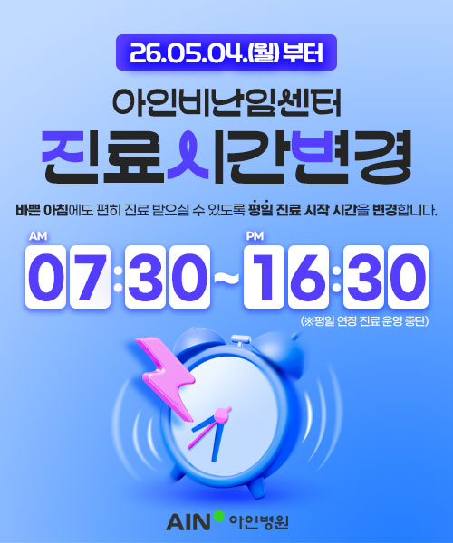 온라인 진료예약 빠른 진료예약 자녀진료예약 건강검진예약 진료예약 변경·취소 대표전화 032) 247-2000 검진센터 032) 459-5000 척추·관절 상담 통합검색 마이 아인 온라인상담 진료예약현황 검사결과조회 아인병원 TV 아인병원의 새로운 소식과 궁금했던 점들을 유튜브에서 시청해보세요. 외래진료안내 입/퇴원안내 진료시간표 증명서 발급안내 자주하는 질문(FAQ) 신생아 앨범 층별안내 오시는길 주차안내 척추관절 아인비난임 수술ㆍ암 회복 건강검진 비만슬리밍 메디컬뷰티 산후 조리원 마더비 문화원수강신청 층별안내 오시는길 주차안내 공지사항 언론보도 채용공고 더보기 공지사항 더보기 [공지] 아인비난임센터 평일 진료 시간 변경 안내(05/04~) [공지] 소아청소년과 5월 영유아검진 예약일정 변경 안내 [이벤트] 아인병원 봄맞이 독일 지멘스사 3.0T MRI 할인 이벤트 안내 (~05/31) [병원소식 ] 면역증진센터 → 수술·암회복센터로 명칭 변경 안내 (4/1 부터 변경) 보도자료 더보기 [유방갑상선센터] "여성 발병 1위 유방암" 주기적인 검진만이 건강 지키는 길 아인병원 갑상선암센터, 미국 글로벌 의료기기 회사와 기술 협력 강화 아인병원 신명호 과장, '부갑상선 보존 갑상선암 수술 사례' 발표 인천 미추홀구, 모자보건 서비스 강화...민관 협력 체계 구축 채용공고 더보기 산부인과 초음파사 채용2026-02-02 총무팀 행정직 대리/과장급 채용(증원)2026-02-04 진단검사실 임상병리사 팀장급 채용2026-02-10 내과 초음파사 채용2026-01-30 층별안내 오시는길 주차안내 진료카드 창 닫기