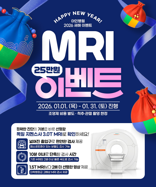 온라인 진료예약 빠른 진료예약 자녀진료예약 건강검진예약 대표전화 032) 247-2000 검진센터 032) 459-5000 예약조회 및 변경/취소 척추·관절 상담 통합검색 마이 아인 온라인상담 진료예약현황 검사결과조회 아인병원 TV 아인병원의 새로운 소식과 궁금했던 점들을 유튜브에서 시청해보세요. 외래진료안내 입/퇴원안내 진료시간표 증명서 발급안내 자주하는 질문(FAQ) 신생아 앨범 층별안내 오시는길 주차안내 척추관절 아인비난임 면역증진 건강검진 비만슬리밍 메디컬뷰티 산후 조리원 마더비 문화원수강신청 층별안내 오시는길 주차안내 공지사항 언론보도 채용공고 더보기 공지사항 더보기 [이벤트/건강검진] 아인병원 2026년 국가건강검진 프로모션 안내🔔 (1~2월 한정) [이벤트] 아인병원 2026년 새해 이벤트, MRI 25만원 할인🎉✨(~1/31) [병원소식/갑상선암센터] 임산부도 안심하고, 안전하게 갑상선암치료가 가능합니다. [병원소식] 25년 11월 임신 성공 / 쌍둥이 출산을 축하드립니다. 보도자료 더보기 아인병원, 중대재해 예방 등 안전한 의료환경 조성 나섰다 한국 ‘단일공 로봇수술’, 美-유럽도 배우러 온다 [척추외과] 반복되는 목 통증과 팔저림, 치료 선택이 필요한 시점 아인병원 '갑상선암 로봇수술'에 미국·유럽 의료진 관심 잇따라 채용공고 더보기 영상의학팀 초음파사 채용2025-10-24 시설관리팀 시설관리직(에어컨관리) 채용2025-12-18 외국인지원팀 러시아어통역 행정직 채용2025-12-19 부서별 간호조무사 채용2025-03-20 층별안내 오시는길 주차안내 진료카드 창 닫기