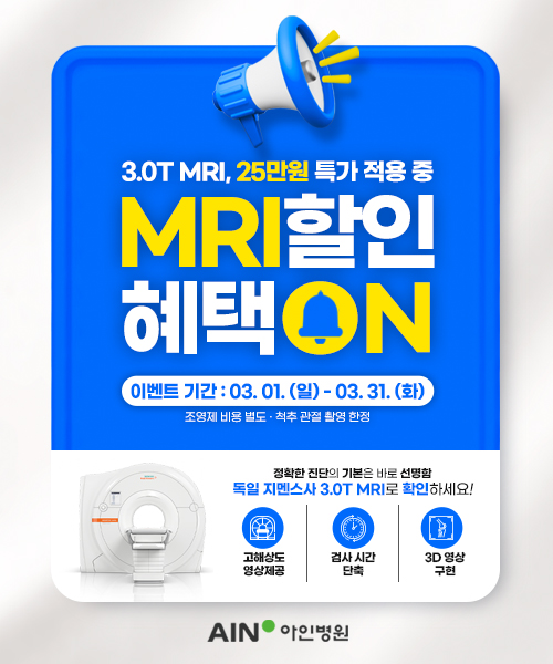 온라인 진료예약 빠른 진료예약 자녀진료예약 건강검진예약 대표전화 032) 247-2000 검진센터 032) 459-5000 예약조회 및 변경/취소 척추·관절 상담 통합검색 마이 아인 온라인상담 진료예약현황 검사결과조회 아인병원 TV 아인병원의 새로운 소식과 궁금했던 점들을 유튜브에서 시청해보세요. 외래진료안내 입/퇴원안내 진료시간표 증명서 발급안내 자주하는 질문(FAQ) 신생아 앨범 층별안내 오시는길 주차안내 척추관절 아인비난임 면역증진 건강검진 비만슬리밍 메디컬뷰티 산후 조리원 마더비 문화원수강신청 층별안내 오시는길 주차안내 공지사항 언론보도 채용공고 더보기 공지사항 더보기 [이벤트] MRI 할인 혜택 ON, 3.0T MRI 25만원 이벤트 안내 🔔✨ (~3/31) [병원소식] 26년 1월 임신 성공 / 쌍둥이 출산을 축하드립니다. [이벤트/건강검진] 아인병원 3월 국가검진 프로모션✨ 치매&유전자검사 할인💚 (~3/31) [공지] 2026년 삼일절 휴진일정 안내 보도자료 더보기 [정형외과] “나이 탓인가 했더니”… 어깨 반복적 통증, 회전근개 질환 신호 이진욱 갑상선암센터장, SPRA 갑상선암 로봇수술 500례 돌파 [정형외과] 아인병원, 정형외과 전문의 박철용 원장 초빙 아인병원, 난임 부부 임신 성공률 높이기 위해 AI 등 첨단 기술 도입 채용공고 더보기 산부인과 초음파사 채용2026-02-02 총무팀 행정직 대리급 채용(증원)2026-02-04 진단검사실 임상병리사 팀장급 채용2026-02-10 내과 초음파사 채용2026-01-30 층별안내 오시는길 주차안내 진료카드 창 닫기