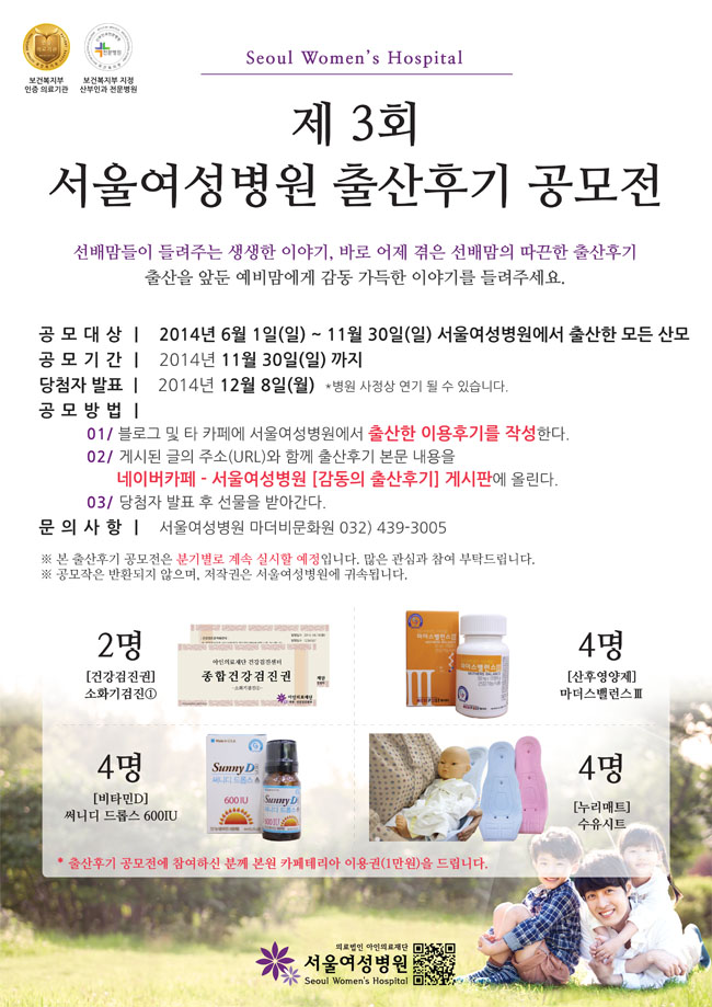 공 모 기 간 | 2014년 11월 30일(일) 까지당첨자 발표 | 2014년 12월 8일(월) *병원 사정상 연기 될 수 있습니다.공 모 방 법 |01/ 블로그 및 타 카페에 서울여성병원에서 출산한 이용후기를 작성한다.02/ 게시된 글의 주소(URL)와 함께 출산후기 본문 내용을 네이버카페-서울여성병원 [감동의 출산후기] 게시판에 올린다.03/ 당첨자 발표 후 선물을 받아간다.(선물은 서울여성병원 마더비문화원에서만 수령 가능합니다.)