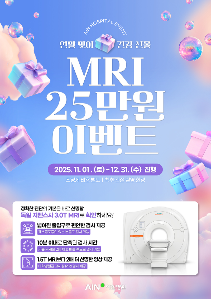 한 해 동안 수고한 고객님에게 드리는 아인병원의 선물! MRI 25만원 이벤트! 🎉이벤트 기간 : 2025. 11.01 ~ 12.31 까지