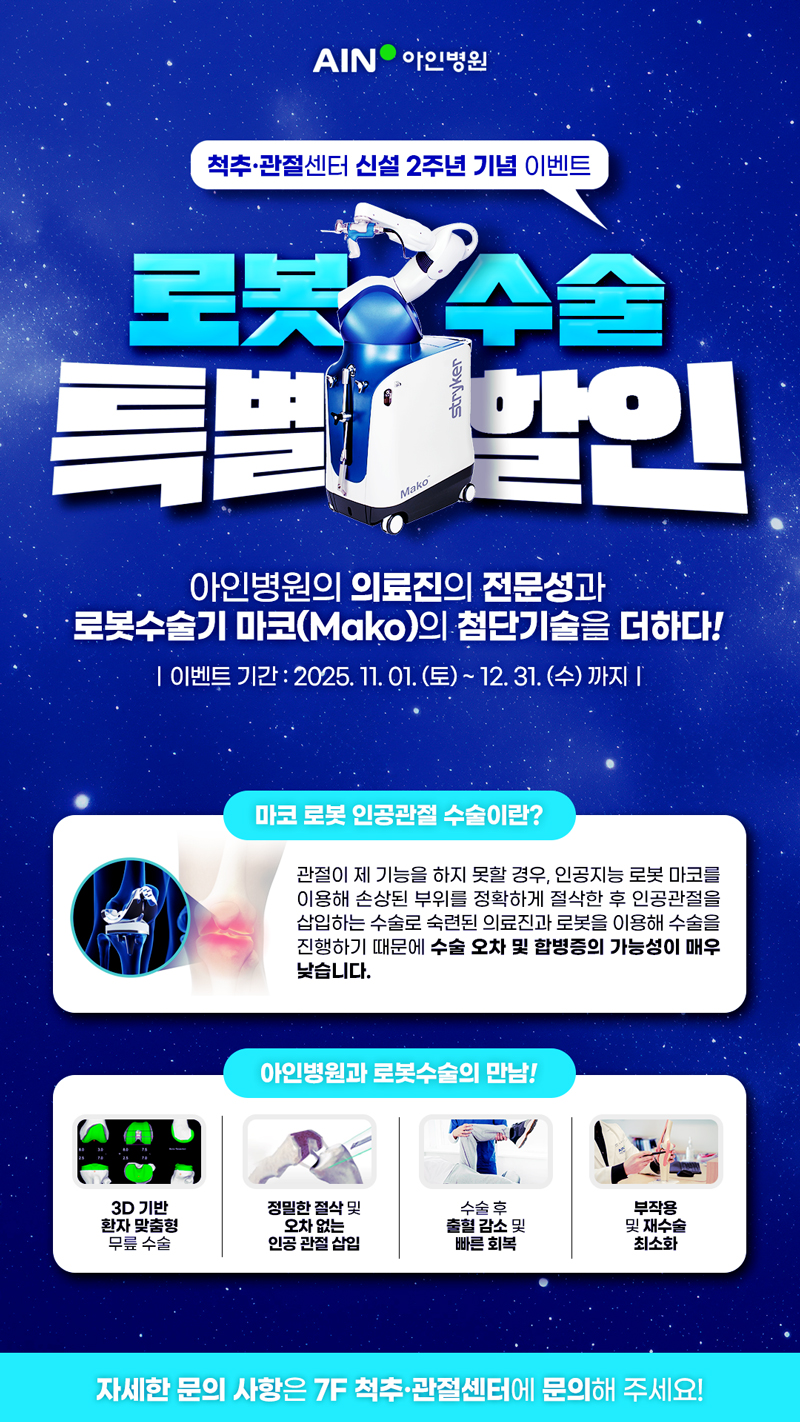 더욱 정밀하고 안전한 인공관절 수술을 제공합니다.📅이벤트 기간: 2025.11.01 (토) ~ 12.31 (수)