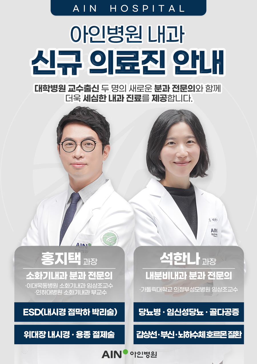 [병원소식] 아인병원 내과 신규의료진을 소개합니다 [소화기내과 분과 전문의 홍지택 과장 / 내분비내과 분과전문의 석한나 과장]