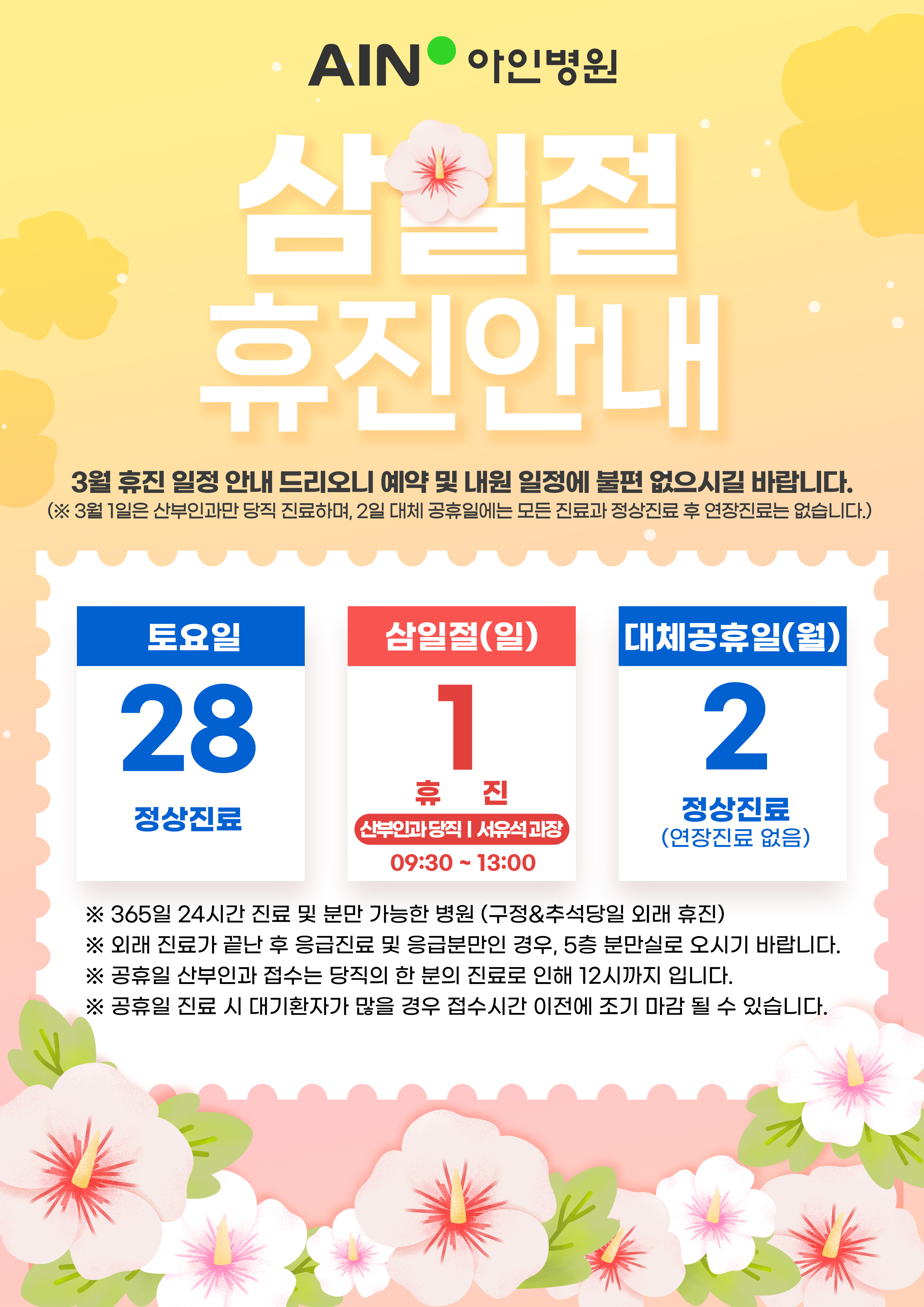 [공지] 2026년 삼일절 휴진일정 안내 조회수: 59 등록일: 2026-02-23 [공지] 2026년 삼일절 휴진일정 안내드립니다.2026년 삼일절 휴진 일정 안내 드리오니예약 및 내원 시 참고하시기 바랍니다. 이전글 [공지] 2026년 설연휴 휴진 일정 안내 다음글 다음글이 없습니다. 목록