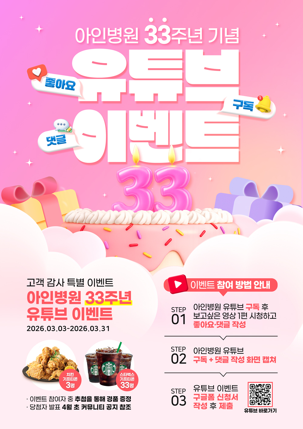 [이벤트] 아인병원 33주년 기념 유튜브 이벤트 안내 🎬🎁 (~3/31)