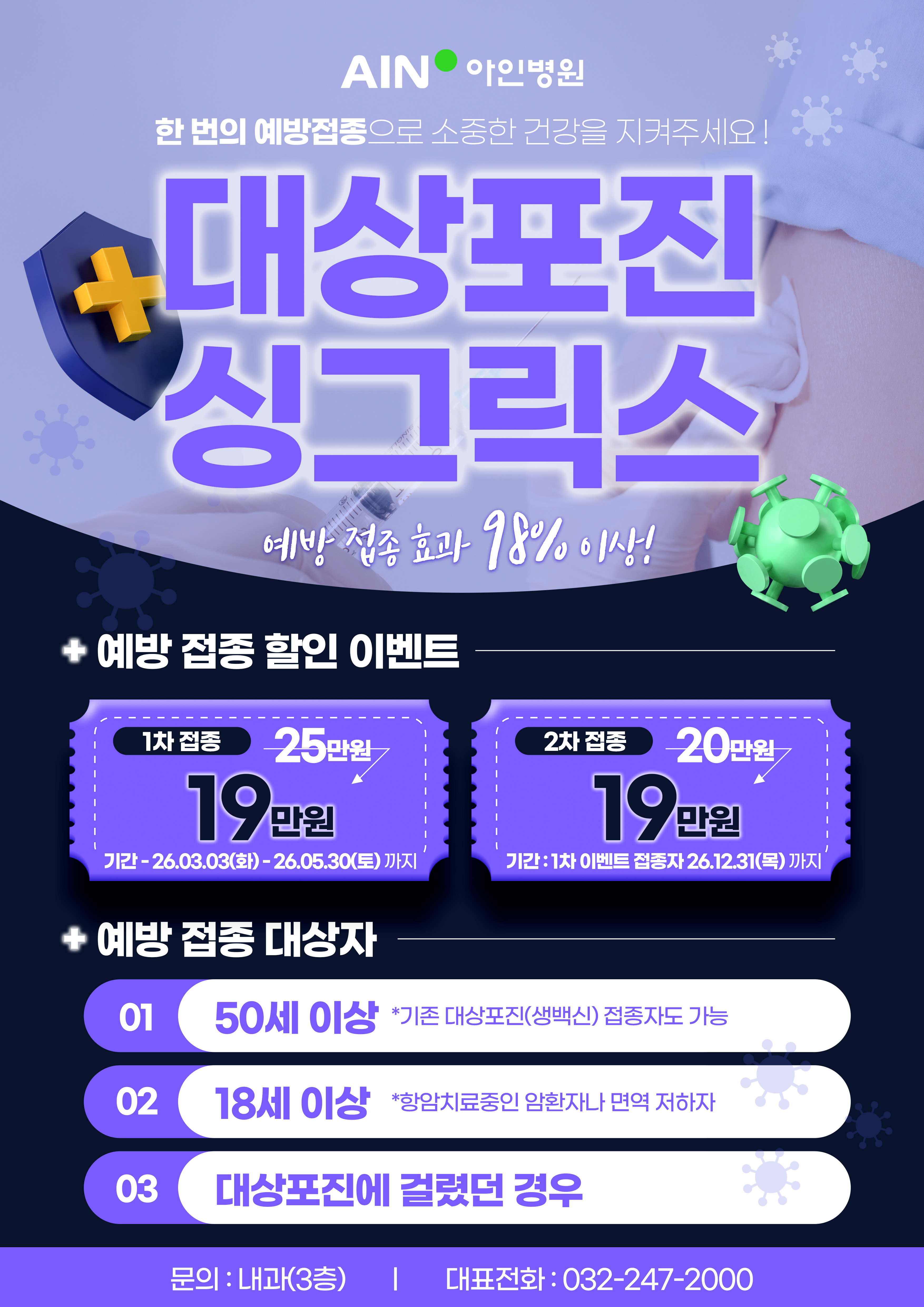 아인병원 내과에서 대상포진 싱그릭스 접종 할인 이벤트를 시행합니다!