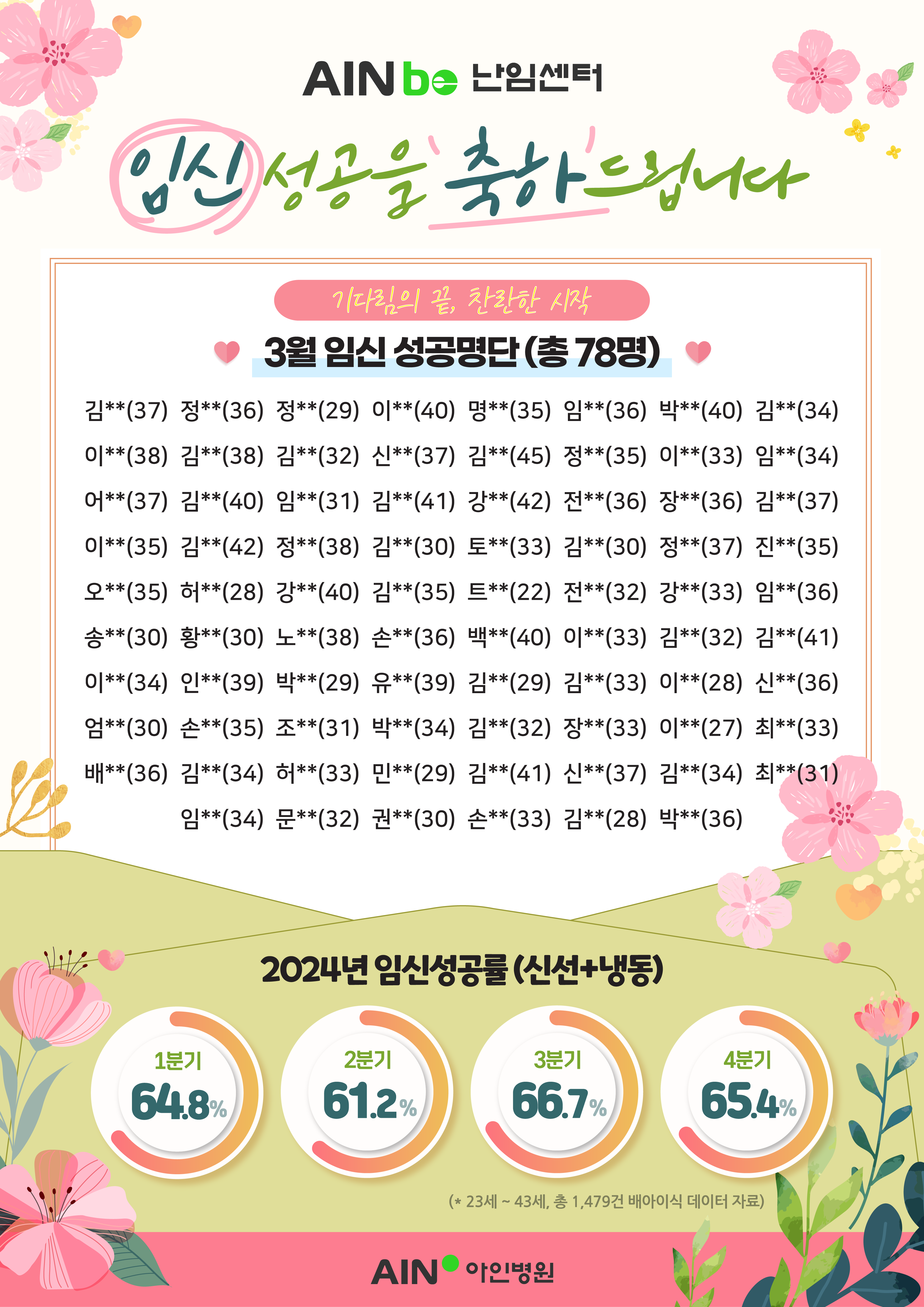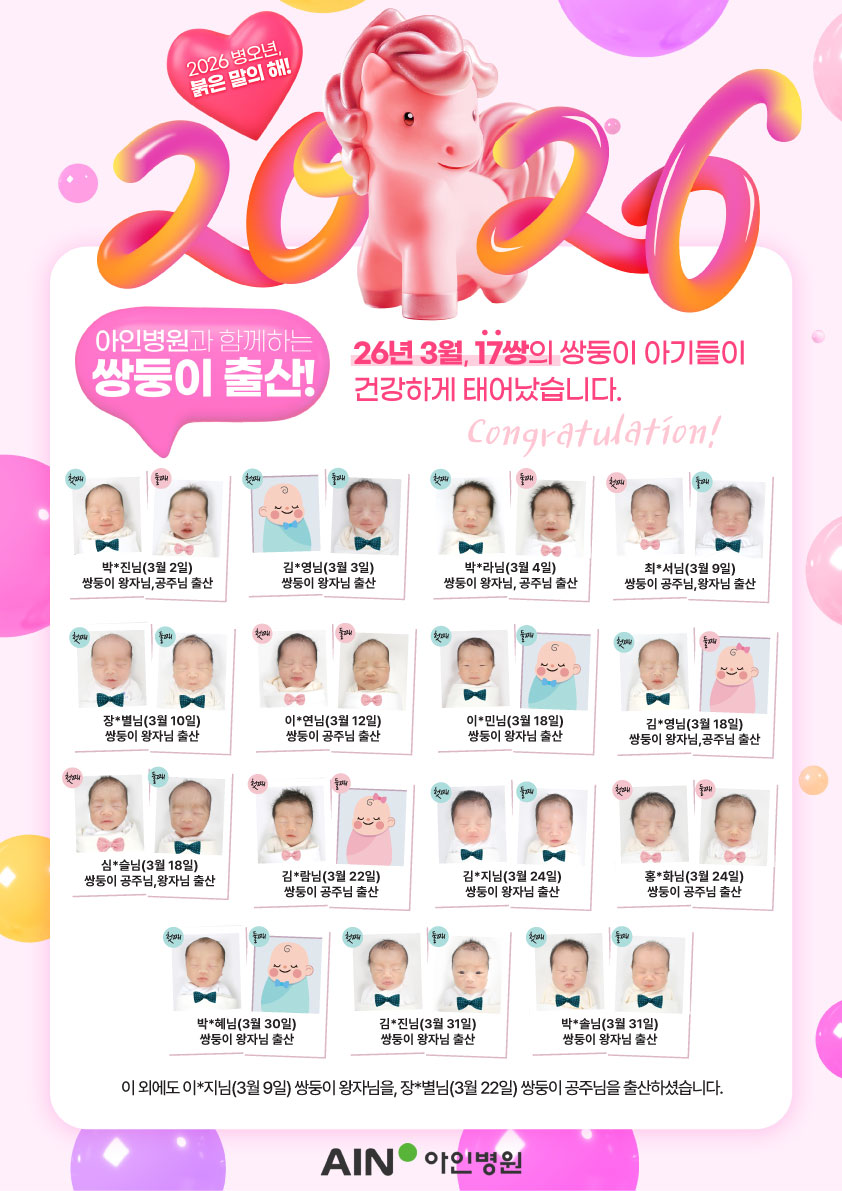 [병원소식] 26년 3월 임신 성공 / 쌍둥이 출산을 축하드립니다. 조회수: 15 등록일: 2026-04-24 ✨아인병원 아인비난임센터✨26년 3월 임신을 진심으로 축하드립니다.🌷쌍둥이 출산🌷아인병원이 함께합니다.26년 3월, 17쌍의 쌍둥이 아기들이 건강하게 태어났습니다. 이전글 [입찰공고] 아인병원 3층영상센터 및 공단검진센터 구축 중 1차 디자인 및 설계업체 선정의 건 (~4/17) 다음글 [이벤트/건강검진] 아인병원 5월 가정의 달, 우리가족 건강검진 혜택💌 목록