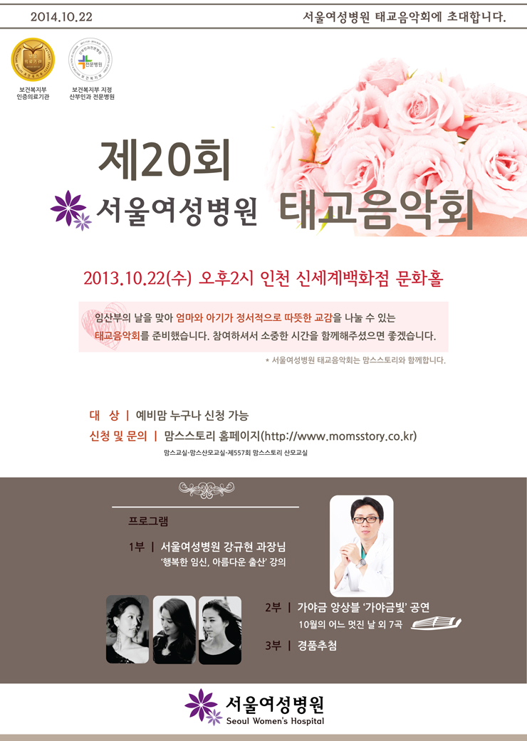 제20회 서울여성병원 태교음악회 개최2013.10.22(수) 오후2시 인천 신세계백화점 문화홀임산부의 날을 맞아 인천 서울여성병원이엄마와 아기가 정서적으로 따뜻한 교감을 나눌 수 있는 태교음악회를 준비했습니다.참여하셔서 소중한 시간을 함께해주셨으면 좋겠습니다.* 서울여성병원 태교음악회는 맘스스토리와 함께합니다.맘스교실-맘스산모교실-제557회 맘스스토리 산모교실프로그램1부 ㅣ 서울여성병원 강규현 과장님‘행복한 임신, 아름다운 출산’ 강의2부 ㅣ 가야금 앙상블 ‘가야금빛’ 공연